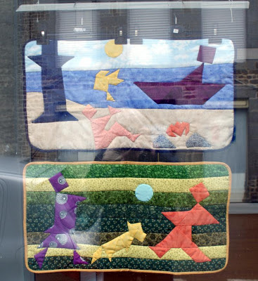The club members suggested to the Mayor that they mount a patchwork exhibition to make the empty shop windows more interesting. What a good idea! It's a brilliant way for the local community to express their love for their surroundings. In each shop window there is a patchwork hanging and a written piece about an aspect of patchwork.